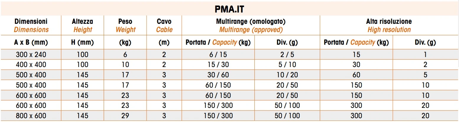 Platformele din gama PMA sunt un instrument indispensabil pentru o varietate larga de utilizari, atat in industrie, cat si pentru cantari in retail. Principalele lor caracteristici includ un design robust, utilizare usoara, instalare simpla si lipsa intretinerii. Construite cu cadre metalice robuste protejate impotriva suprasarcinilor accidentale; sunt echipate cu picioare reglabile pentru a simplifica nivelarea instrumentului. Datorita versatilitatii lor, pot fi utilizate in linii de procesare si control. Greutatea este masurata cu un celula de incarcare OFF CENTER aprobata, construita din aluminiu. Sistemele de cantarire configurate in acest fel sunt conforme cu directivele CE in conformitate cu directiva 2014/31/UE.