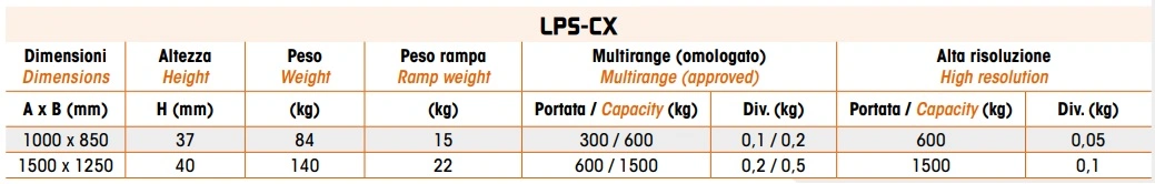 Platformele din seria LPS se remarca prin profilul lor extrem de redus (<40 mm) si proportiile lor, care sunt deosebit de potrivite pentru cantarirea marfurilor pe transportoare sau transpaleti actionati cu timona. O solutie ideala pentru industria alimentara, cu mobilitate optima si o constructie integrala din otel inoxidabil care permite o curatare usoara si temeinica. Greutatea este inregistrata prin intermediul a 4 celule de sarcina din otel inoxidabil, conform specificatiei IP 67. O structura unitara, de asemenea realizata integral din otel inoxidabil AISI 304, incorporeaza elemente laterale de rezistenta indoite direct din metalul platformei, astfel incat fata superioara este lipsita de suduri. Fixate direct pe structura platformei si pe picioarele reglabile, celulele de sarcina ofera un mediu de masurare a greutatii simplu, functional si absolut fara necesitati de intretinere. De asemenea, echipamentul include rampe de acces din otel inoxidabil usor de asamblat.