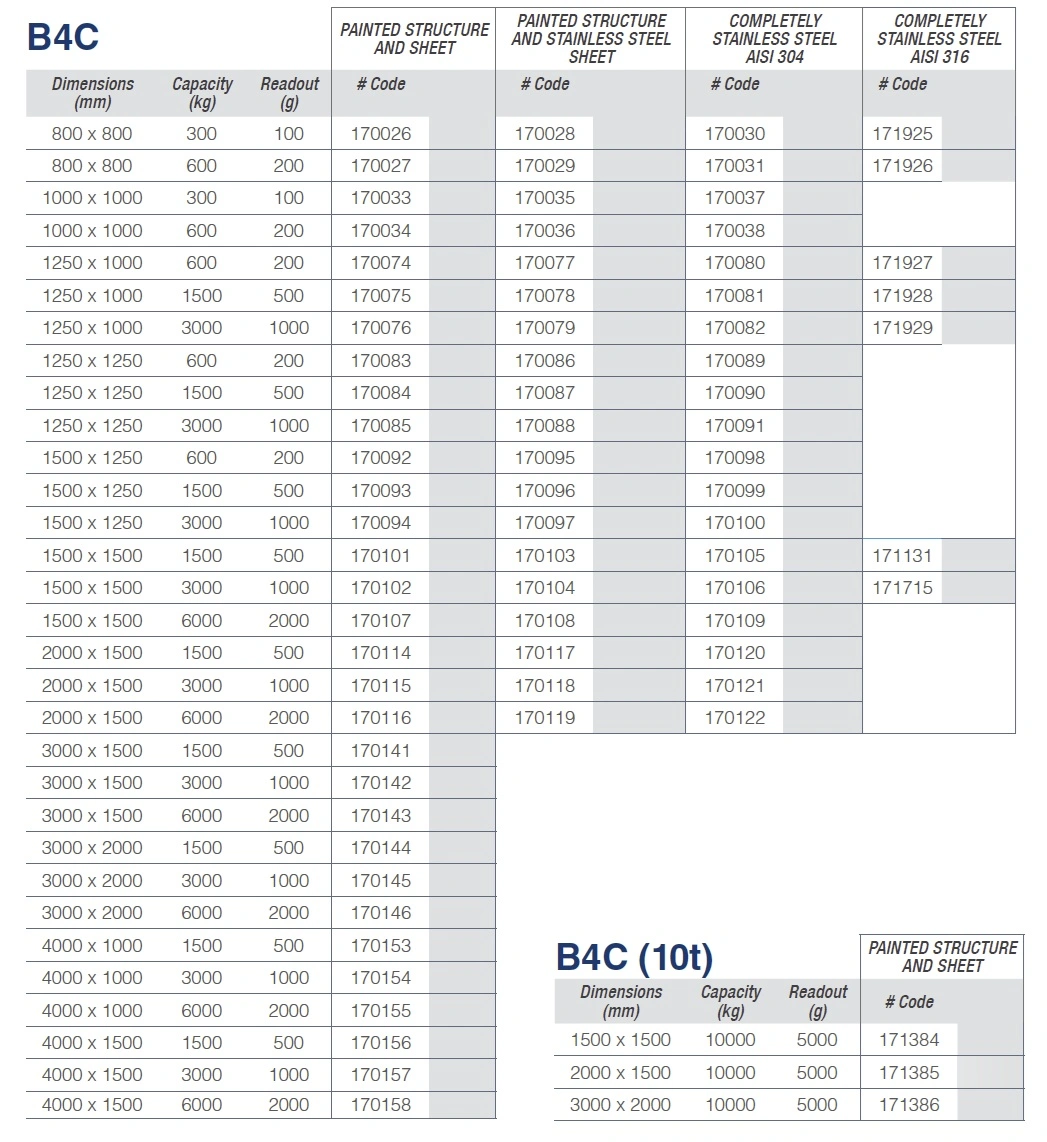 Platformele din seria B4C au capacitati cuprinse intre 300 kg si 10.000 kg cu dimensiuni intre 800 x 800 mm pana la 4000 x1500 mm.