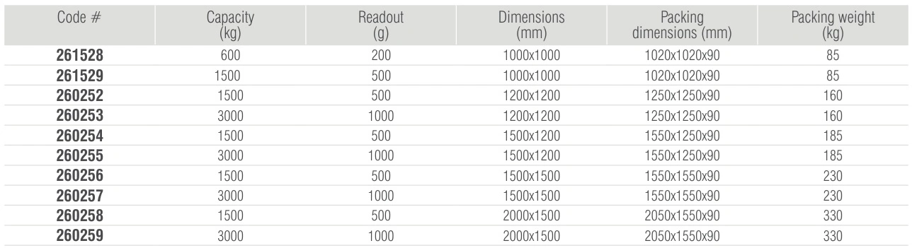 Platformele din seria BVS au capacitati de 600 kg, 1500 kg si 3.000 kg cu dimensiuni de 1000 x 1000 mm, 1200 x 1200 mm, 1500 x 1200 mm, 1500 x 1500 mm, 2000 x 1500 mm.